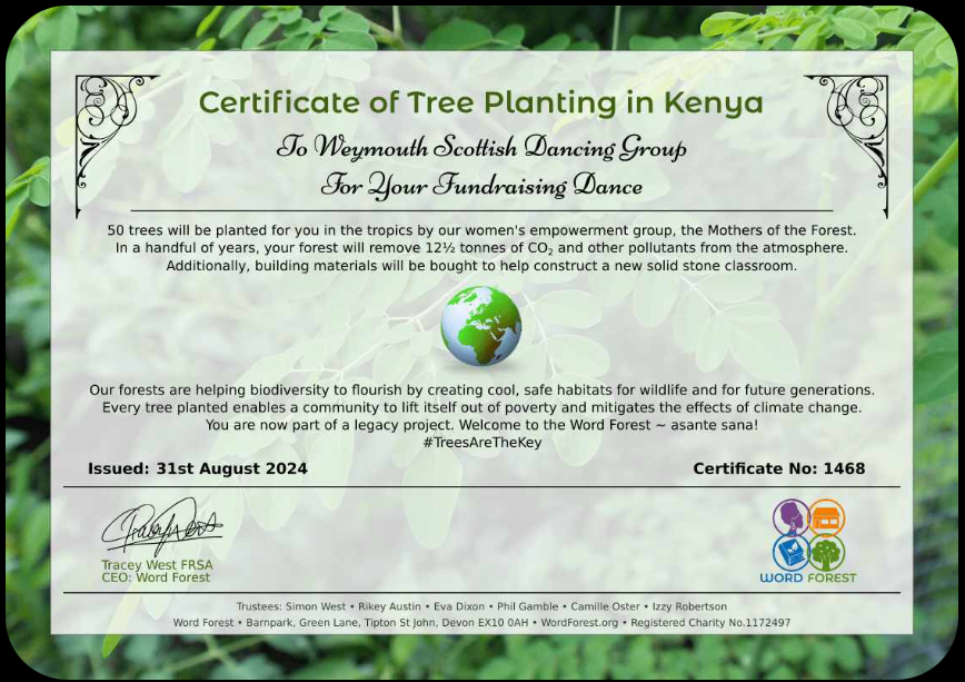 | Saturday 31/08/24 | Charity Ceilidh supporting Word Forest | Flyer Thank you to all who came to the Ceilidh. A fun evening with £130 raised for Word Forest. This amount allows 50 trees to be planted for us. Click here to view Certificate |