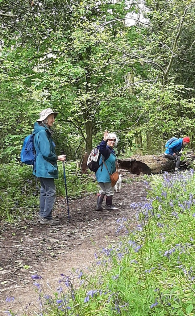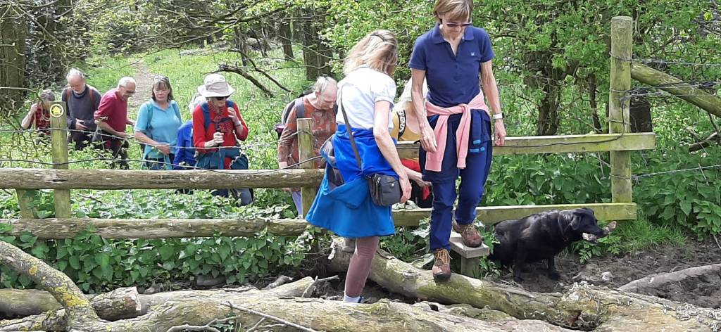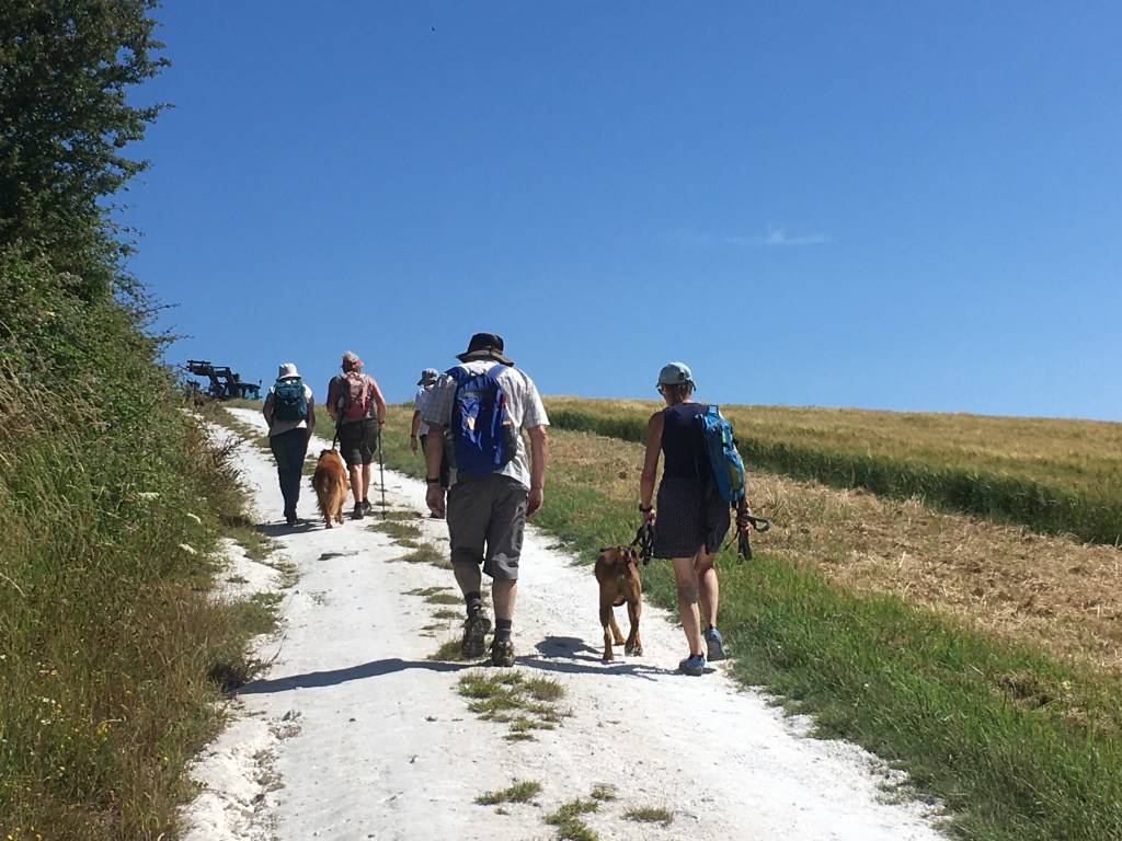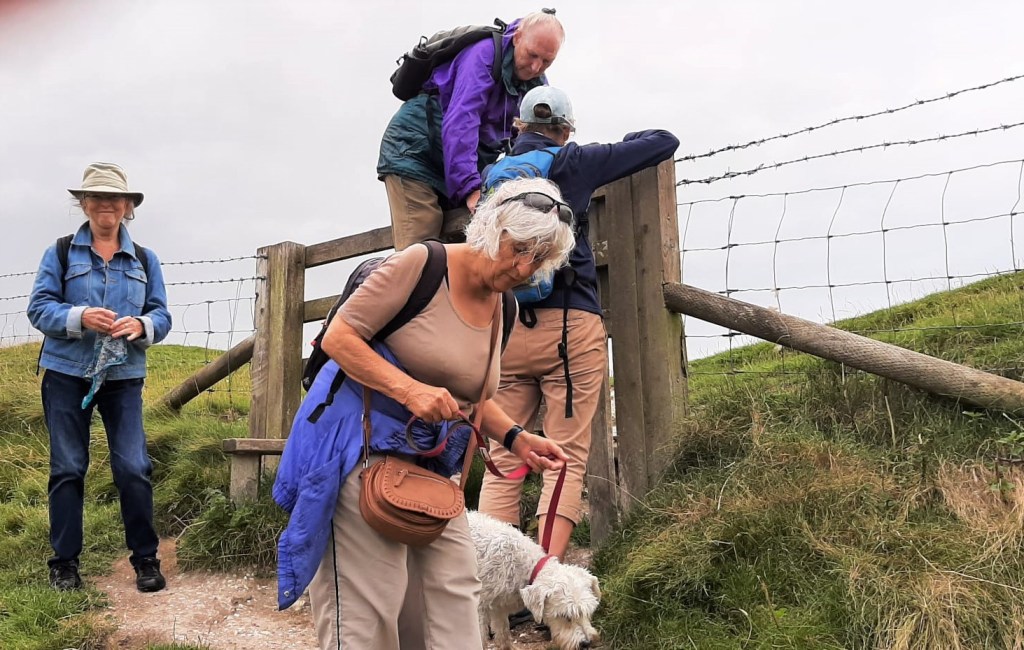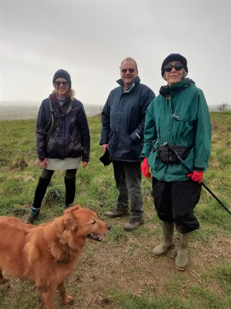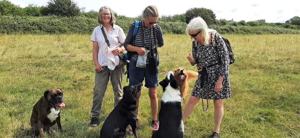 Lovely walk with great views and fantastic weather. Six walkers and four dogs took part. Pat (our reliable photographer) is only visible in one photo and it is a back view. Sorry Pat, we missed the opportunity with the cows!
